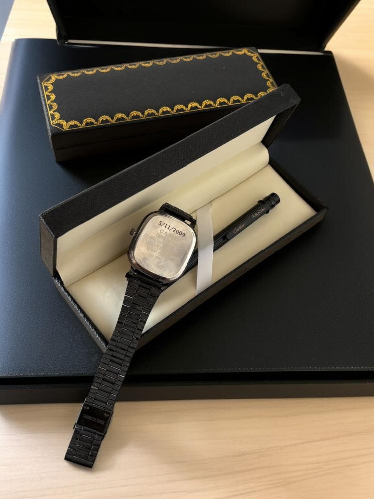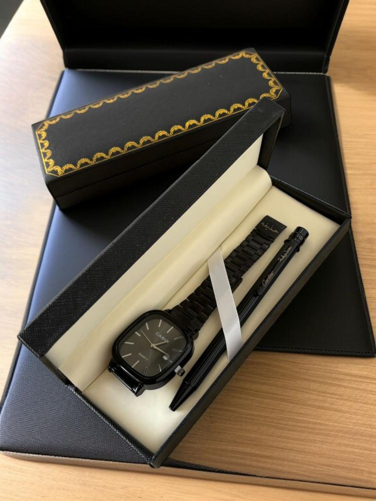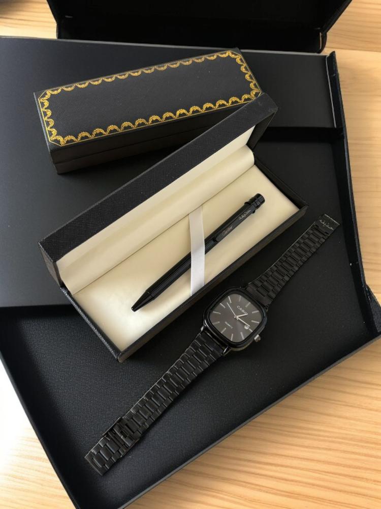 طقم هدية فاخرة مميز ومخصص لمن تحب يتكون من ساعة كاسيو أصلية محفورة بالاسم وقلم أنيق بتصميم كارتير محفور بالاسم مع علبة فاخرة بتنسيق راق وكرت عبارة حسب الطلب